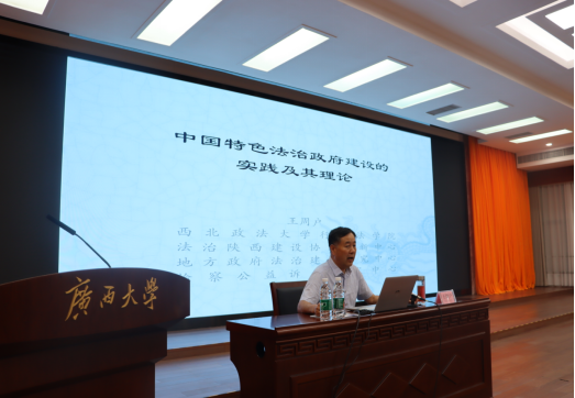 10月16日西北政法大学行政EMC易倍体育王周户教授应邀到公司作“中国特色法治政府建设的实践及其理论”学术专题讲座。EMC易倍体育本科生、硕士研究生、教师代表及西北政法大学在邕部分员工到场聆听讲座,讲座由EMC易倍体育教授汪太贤主持。