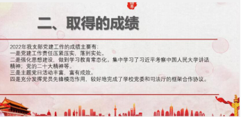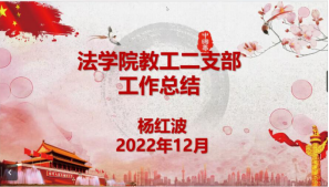 教职工第二党支部书记杨红波在其述职报告中主要就2022年工作的开展情况、取得的成绩、存在的问题、下阶段的工作思路和举措四大方面展开。教职工二支部通过全面从严治党,落实党建责任,强化思想教育建设,开展主题党日活动,提高党性修养,坚持求真务实,认真落实党建专项工作和课程思政等,在总结过去一年的成绩以及总结相关问题下,提出了相关举措:将进一步做好服务型党组织建设,落实“四位一体”管理方法和“党员固定日”制度及上好“三会一课”、民主评议、上党课制度;促进党建和业务工作融合发展,紧紧围绕公司中心,推动EMC易倍官方网站法学学科大发展;加强支部建设,提升支部党建科学化水平。