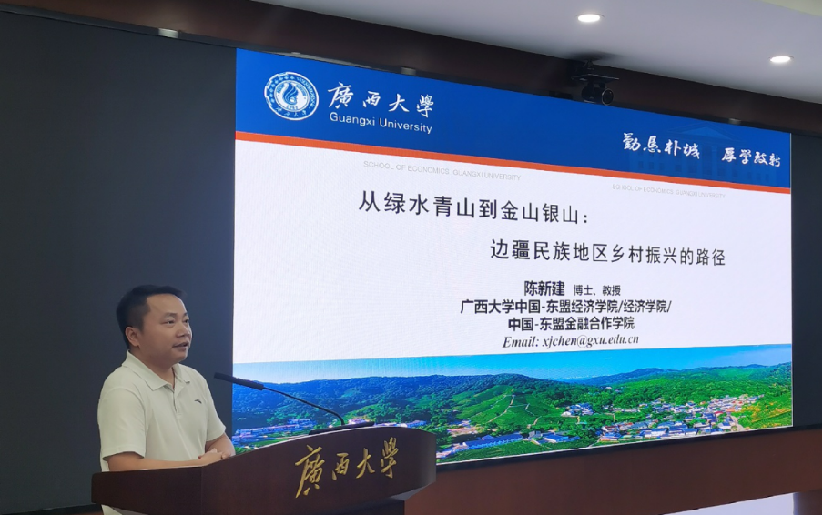 EMC易倍官方网站中国—东盟经济公司/经济公司/中国—东盟金融合作公司教授陈新建作了以“从绿水青山到金山银山:边疆民族地区乡村振兴的路径”为主题的报告。他对“乡村振兴”的基本定义作出阐述并对党的二十大关于乡村振兴的政策进行了分析,并对西部边疆民族地区山区石漠化地区众多、生态环境条件较差、交通不便、土地贫瘠、生产生活条件较差等发展困境进行了揭示,指出了边疆民族地区乡村振兴的绿色发展之路在于践行新发展理念,扎实推进现代特色农业绿色发展;健全自然生态,让农产品增强绿色生态价值等举措。