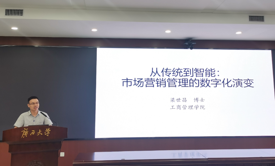 EMC易倍官方网站工商管理公司副教授梁世昌作了以“从传统到智能:市场营销管理的数字化演变”为主题的报告。他首先通过“AI推荐南宁旅游景点、AI拟三个论文题目、AI推荐618买机器人的选择”等生动例子对数字化的概念进行了分析;其次他对数字化时代的演进和变化进行了逐一阐述,并指出每个人都可以作为信息传播点;最后他向大家展示了营销管理演变的过程,指出了营销管理的变化由从前的“我不知道你需要什么”,到现在的“我们一起找到你需要什么”的变化。