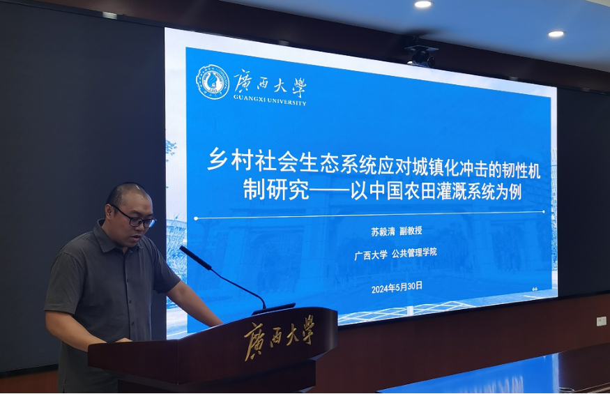 EMC易倍官方网站公共管理公司土地资源管理系主任、副教授苏毅清作了以“乡村社会生态系统应对城镇化冲击的韧性机制研究—以中国农田灌溉系统为例”为主题的报告。他表示城镇化是发展中国家实现现代化的基本途径,在城镇化的影响下,有的乡村能够经受住外部冲击从而保持着发展的活力,而有的村庄却最终在外部冲击下走向了衰亡,并分析了在城镇化影响下劳动力外流对土地流转的非线性的影响。他指出确保乡村社会生态系统在城镇化影响下维持韧性的关键在于通过集体选择过程对操作过程提供制度规则保障。