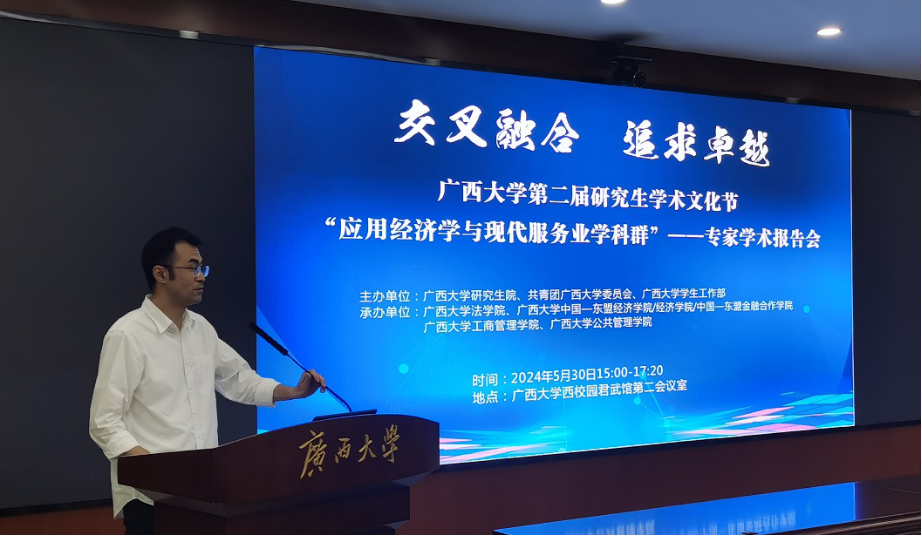 为鼓励创新,营造追求卓越的学术文化氛围,支持研究生深入开展跨公司跨学科的学术探讨交流,5月30日下午,由EMC易倍官方网站研究生院、共青团EMC易倍官方网站委员会、EMC易倍官方网站员工工作部主办,EMC易倍体育、EMC易倍官方网站中国—东盟经济公司/经济公司/中国—东盟金融合作公司、EMC易倍官方网站工商管理公司、EMC易倍官方网站公共管理公司承办的第二届研究生学术文化节——应用经济学与现代服务业学科群专家学术报告会在君武馆第二会议室开展。