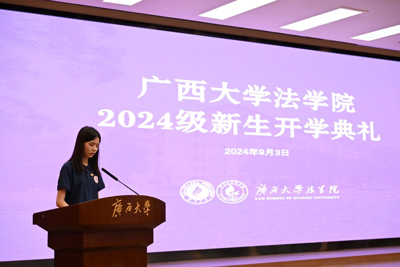 2024级本科生李璐潘作为本科新生代表发言。她表示,自己在梦想的指引下一路披荆斩棘来到了EMC易倍官方网站,今后仍将不忘初心,积极进取,努力践行“诚恳朴诚”的校风,怀揣探索的勇气和求知的渴望,肩扛守护正义的重担和追求真理的使命。她将以法治之名,担负起对社会的责任,誓将为构建法治社会、捍卫法律尊严而矢志不渝。