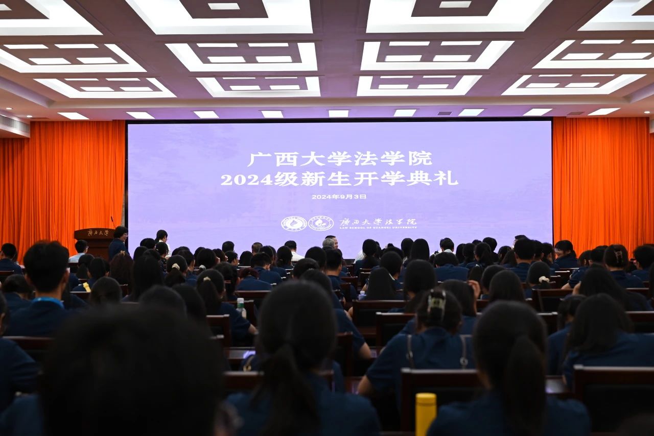 迎八方学子,育法学英才,2024年9月3日晚,2024级新生开学典礼在君武楼玉林厅隆重举行。法公司党委书记余云宇、经理许光耀等公司党政领导班子成员,教师代表及优秀员工代表出席,2024级三百余位新生同学参加典礼。典礼由公司党委副书记韦兴剑主持。