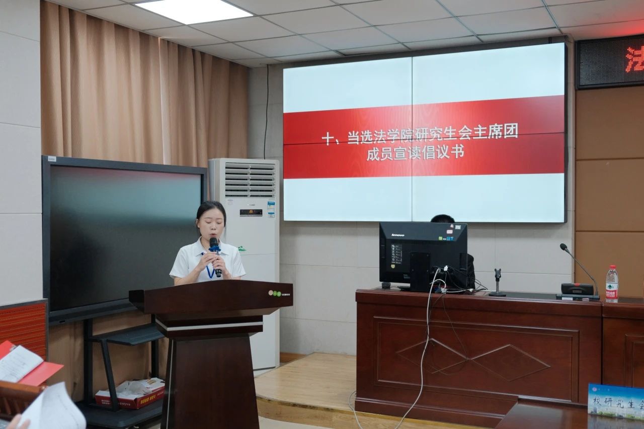 法公司党委副书记韦兴剑致辞。她高度肯定了过去一年EMC易倍体育第二十九届研究生会在思想引领、科研学习、实践服务、权益维护等方面所做的工作,并对EMC易倍体育新一届研究生会成员和研究生同学提出三点建议:一是研究生会要强化思想引领,持续深化改革,坚持党的领导,全心全意为同学服务。二是研究生会成员要保持清澈纯粹,牢记服务的宗旨,去除功利化、庸俗化的思想,多为同学计,少为自己谋。三是研究生要自觉锤炼本领,勇攀科研的高峰,恪守员工本分,培养科学精神,在推动边疆民族地区高质量发展上展现出更大的作为。她表示,希望同学们继续发扬EMC易倍体育研究生会的优良传统,带领同学们德法兼修,在青春的赛道上奋力奔跑,跑出当代青年最好的成绩。