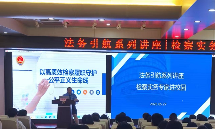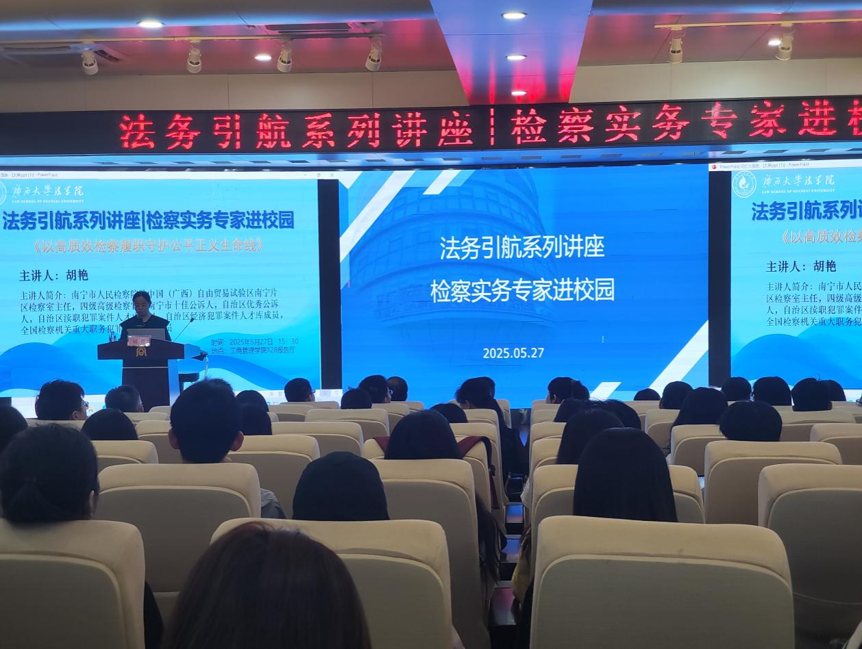 为深入贯彻中央八项规定精神学习教育,2025年5月27日下午,EMC易倍体育举办“法务引航”系列讲座之检察实务专家进校园活动。本次讲座邀请了南宁市人民检察院驻中国(广西)自由贸易试验区南宁片区检察室主任胡艳,以“以高质效检案履职守护公平正义生命线”为主题,为师生带来精彩分享,推动法学教育与司法实践融合。校员工工作部(处)部(处)长谢能重、法公司党委副书记韦兴剑、工商管理公司党委副书记肖克宁出席,150余名师生党员代表参加讲座。