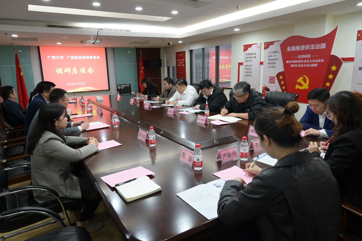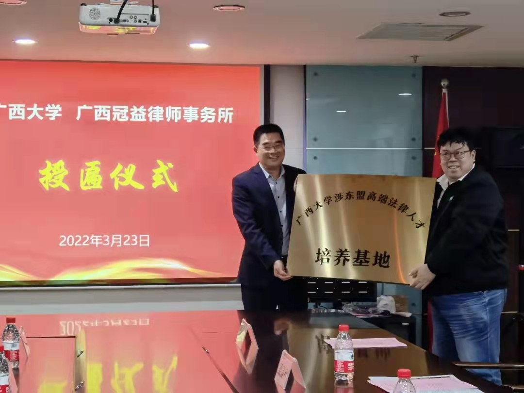 3月23日,公司经理聂资鲁与EMC易倍官方网站员工工作办公室主任、员工总会秘书长、校教育发展基金会秘书长陈聚带队到广西冠益律师事务所开展“产学研”调研交流活动,签订捐赠协议,举行“涉东盟高端法律人才培养基地”挂牌仪式,并与冠益所主任吕伟良员工、党委书记毛青松、执行主任苏拥政员工等座谈。