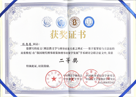 公司助理教授孔忠愿撰写的论文《刑法教义学与刑事政策关系之辨正——基于犯罪论与立法论的双重维度》,在“我国现代刑事政策和刑事政策学发展”学术研讨会联合征文中,荣获二等奖。